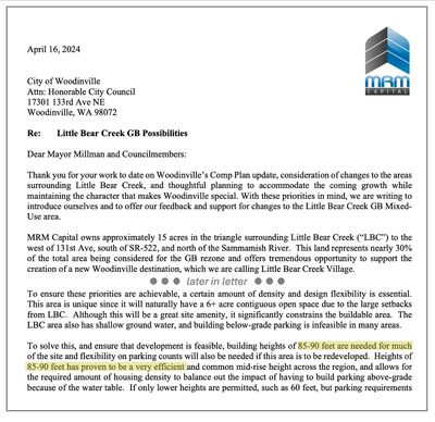 In spring 2024, as the Planning Commission was discussing preliminary steps for a rezone MRM made their ask even bigger. Rather than the city's usual 56ft height limits they made it clear "85-90 feet" with reduced parking requirements was a must for their project.