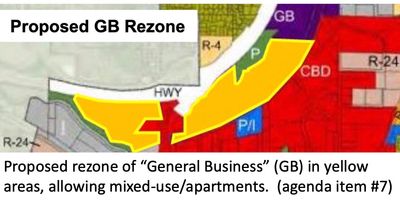 #7 — Discuss rezoning “General Business” area allowing mixed-use/apartment blocks (McLendon’s to Barnes&Noble, north side of the old tracks — see picture) [Facebook discussion of this agenda item]